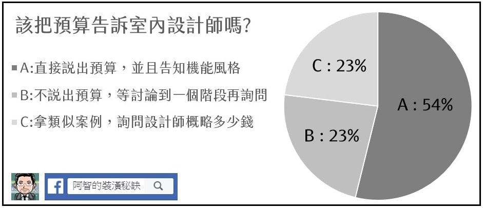 阿智陷入了進退維谷的困境。於是在臉書求助,最後依照統計數字最高票,選擇誠實告知預算。設計師確認他的需求和風格方向後,拿起計算機按了又按。