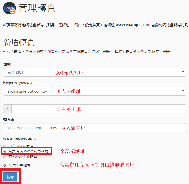 接下來要設定新舊網域轉址。