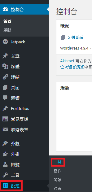 登入Wordpress後台,至 設定 > 一般。