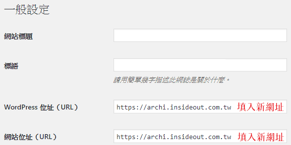 WordPress設定填入新網址,記得原登入後台的路徑也會更換。